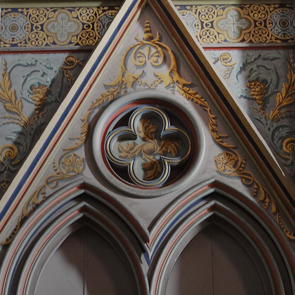 Así, la decoración llena de policromías y dorados, de las columnas y bóvedas recuerda especialmente a las del gótico francés, como la Sainte Chapelle en París o la Catedral de Sainte Cécile, en Albi, mientras que las escenas de las pinturas murales (ejecutadas sobre tela), presentan un aire más romántico, donde las escenas religiosas aparecen en ambientes bucólicos, llenos de cielos y naturaleza, libres de las construcciones propias del neoclásico. Hay quien ha relacionado la decoración de columnas y muros con las ideas de William Morris, dada la presencia de los trazos del autor, el uso de patrones, y la gama cromática utilizada.